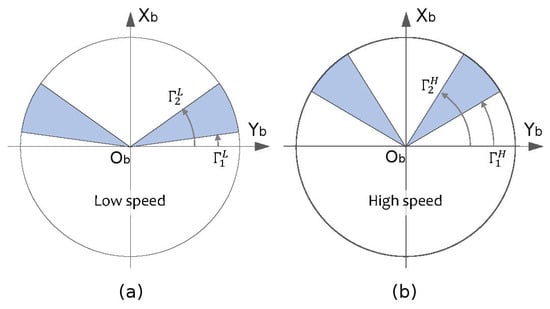 Obstacle avoidance sectors. (a) Definition for low speed mode. (b) Definition for high speed mode.