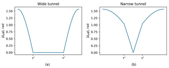 Using this formulation the potential field is zero for each sector outside of the reactive distance, beyond this point grows following a non-linear law until it reaches a angle correction near the wall. The resulting yaw correction is represented in Figure 7 for wide and narrow tunnels.