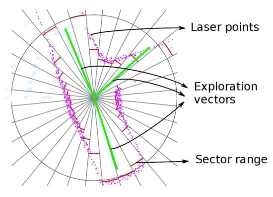Next we will introduce the exploration vector . It is defined as a suitable direction to explore from the present vehicle position. The search for exploration vectors starts selecting the sector with the largest range from the last laser scan. If the range of this sector is long enough, this sector will be the seed for a new exploration vector.