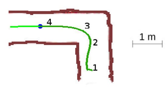 The detailed sequence is shown in Figure 20. The robot set the rotate mode and rotates the vehicle towards the third exploration vector. When already oriented, it switches to the advance mode at point 2. As the new corridor is very narrow, the obstacle avoidance is in the narrow tunnel situation represented in Figure 7. Notice the large yaw corrections, to the right at location 3 and to the left at location 4.