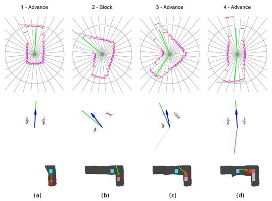 Different local path planning strategies can be defined: Deterministic tree-based, assigning different branch gains to select the next direction [], random tree [], or probabilistic road map []. Besides, the path planning process should be complemented with an obstacle avoidance mechanism. Different methods have been tested, such as artificial potential fields (APF) [,] where obstacles generate a repulsive force, and sector-based [,] or gap-based methods [] that look for the best open space to decide the next movement.