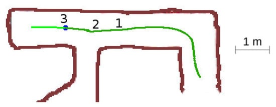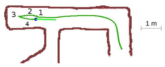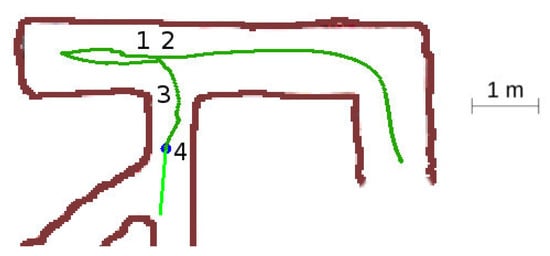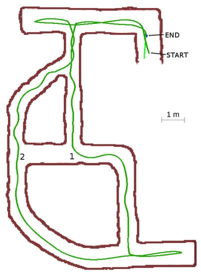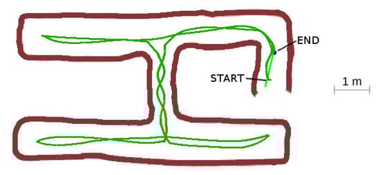 This labyrinth represents a more complex situation to evaluate the path planner algorithm response. The robot traveled the curved gallery at the bottom-left of Figure 23 in advance mode the entire time, without the need to change to the block or rotate modes as the curve could always be followed using a continuation vector. The resulting path used to explore and return to base was optimum, although some oscillations arose in the narrowest sections.