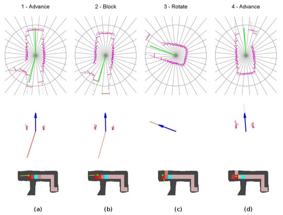 To prevent these problems, a dynamic planning is proposed based on exploration vectors, a novel variant of the open sector method with reinforced filtering []. In particular, it enhances previous approaches by introducing a two-stage filtering combined with hysteresis. First, the sectors are grouped in representative exploring vectors, then a low pass filtering of the azimuth and distance is performed, and finally, a hysteresis filter is applied in an analogous way as in radar processing. At the same time, the required global awareness is maintained using a visited zone grid. Obstacle avoidance is performed primarily by the directional guide of the exploration vectors and secondary by a reactive yaw correction near the walls. Finally, labyrinth solving (intricate mine galleries are genuine labyrinths) is done using a modified Tremaux’s [] algorithm that does not need to store the global logical map.
