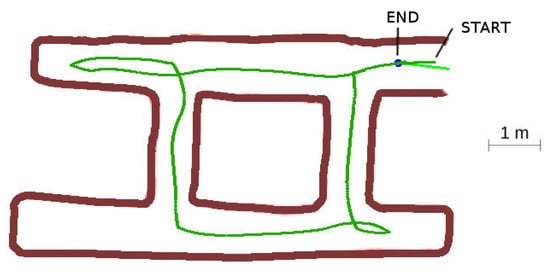 The cyclic labyrinth case, represented in Figure 22, shows the cost paid for the maze resolution without a global map. The bottom left corridor was not traveled. In this concrete case, the complete labyrinth was explored due to the LIDAR vision range from the bottom left intersection, but in other cases part of the labyrinth might be left unexplored. This is common in all of the algorithms that do not use a global logical map [], but as the algorithm calculates the exploration vectors in the intersections, enough information can be saved to detect this circumstance. The robot returned correctly to base.