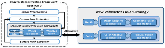 The general framework for reconstructing static scenes consists of five parts: input RGB-D data stream, image preprocessing, camera pose estimation, volumetric fusion and update, and surface mesh extraction, as shown in the left image in Figure 1, among which the volumetric fusion step plays an especially important role. Classical volumetric fusion strategy usually uses point-based sampling and weighted average to calculate surface geometry and texture information. For the geometry, this method works well because it is based on the assumption that the depth data noise obeys Gaussian distributions with zero means. Therefore, through repeatedly sampling and integrating, the geometric noise can be effectively reduced to get a smooth reconstruction surface. However, for textures, if the weighted average fusion strategy is directly applied to texture fusion, it will lead to obvious blurring problems. The main reason is that due to the existence of camera pose estimation errors, the pixel information sampled from different RGB-D frames cannot match perfectly. The depth difference between these mismatched pixels is usually small, which will only affect the geometric fusion result slightly, but its color difference can be obvious, especially for texture-rich scenes where the colors on neighborhoods usually change sharply. By averaging the colors on such pixels to get the texture will inevitably lead to texture blur.