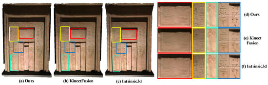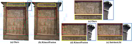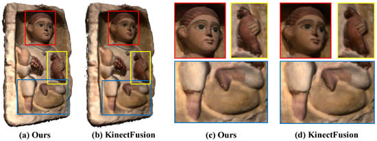 As shown in Figure 9, we can find that our method can significantly reduce geometric and texture errors compared with the KinectFusion method, especially in the region with large surface fluctuations. The obvious improvement mainly benefits from the depth edge noise weight field avoids the interference of outlier noise on the surface, and our two-step refined pose estimation results avoid the surface discontinuity or the jittery effect caused by pose error.