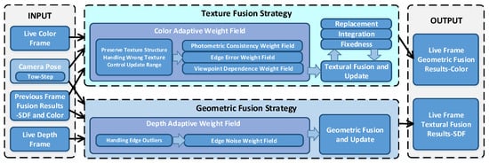 When inputting the real-time frame, camera pose, and the result of previous fusion, our method firstly calculates the adaptive weight field of depth data and RGB data, respectively. Then, we fuse and update the geometry and texture of voxels with the calculated adaptive weight field.