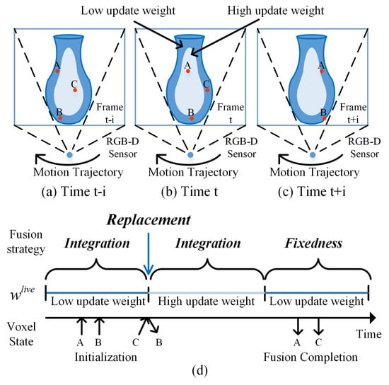 As shown in Figure 4, where “A”, “B”, and “C” represent three types of voxels that undergo different weight updating processes when the camera view changes with time. The voxel state in this figure represents the updating period from the beginning to the end of voxel “A”, “B”, and “C” over time. The up arrow indicates the start time, and the down arrow indicates the end time. The frame weight  in the lower part of this figure stands for the confidence weight change of the frame data corresponding to voxel at different times. Figure 4a–c show the position of “A”, “B”, and “C” voxels, and the different confidence weight of the frame data at different times. The light blue represents the high-reliability data area in the frame. On the contrary, the dark blue represents the low-reliability data area in the frame.