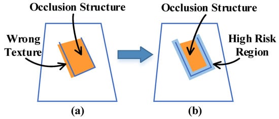 Description of edge error weight field modeling. (a) shows the problem of the wrong texture in the edge area of the scene, (b) shows that the high-risk area can be marked and the data reliability of these areas can be adjusted to avoid the wrong texture.
