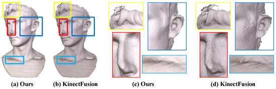 By comparing the results of geometric reconstruction in Figure 8, it can be found that our method can better suppress the noise of the depth map, and obtain a more complete and smooth surface than the online KinectFusion [] method. This is mainly because we consider edge noise to effectively reduce the influence of edge outliers on the surface fusion results, thus accelerating the surface convergence process.