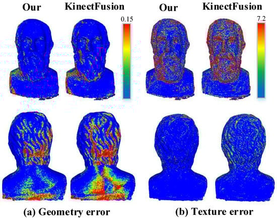 To show that our method can effectively suppress the influence of noise, we use the Sokrates model [] to generate true RGB-D data and true camera pose, and then add 0.1 mm, 0.5 mm, and 1.0 mm Gauss noise to RGB-D image respectively, and add slight perturbations to camera pose to obtain the synthetic RGB-D data. With these data, we quantitatively compare the geometric accuracy and texture accuracy of the reconstruction results between KinectFusion and our approach by using both 1.0 mm-sized voxels and 2.0 mm-sized voxels.