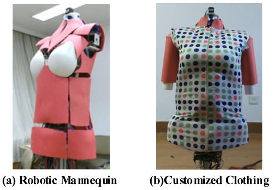 A real reference experimental platform. (a) we use a robotic mannequin developed in our lab []; (b) the clothing on the robotic mannequin will be reconstructed to test the adaptive weight field.