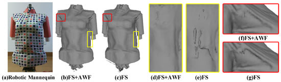 The validation of the depth adaptive weight field, (a) is the used robotic mannequin and customized clothing; (b,d,f) are the results obtained by using the new fusion strategy (FS) and the adaptive weight field (AWF); (c,e,g) are the results obtained only by using the new fusion strategy (FS).
