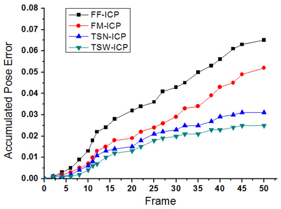 Based on our experimental platform, using the same scene and data acquisition method as the second experiment, we collected an RGB-D dataset containing 479 frames and uniformly sampled and selected 50 frames as keyframes to test the pose accumulative error of different pose estimation methods. We use the off-line global optimization method to get the pose of our dataset to approximate the true value to calculate the pose error, such as the method proposed by Zhou []. Therefore, we carried out comparative experiments for four different ICP methods, and the results are shown in Figure 13.