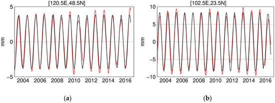 where is the linear trend; for , and are the harmonics for the annual signal (); and for , and are the harmonics for the semi-annual signal (). In this case, for annual signal, the amplitude is represented as , which is unchanged with time. Through LS, the linear and the seasonal signal of constant amplitudes can be obtained. While in fact, the parameters to estimate in Equation (3) are related with time; to be more rigorous, they should be expressed as: