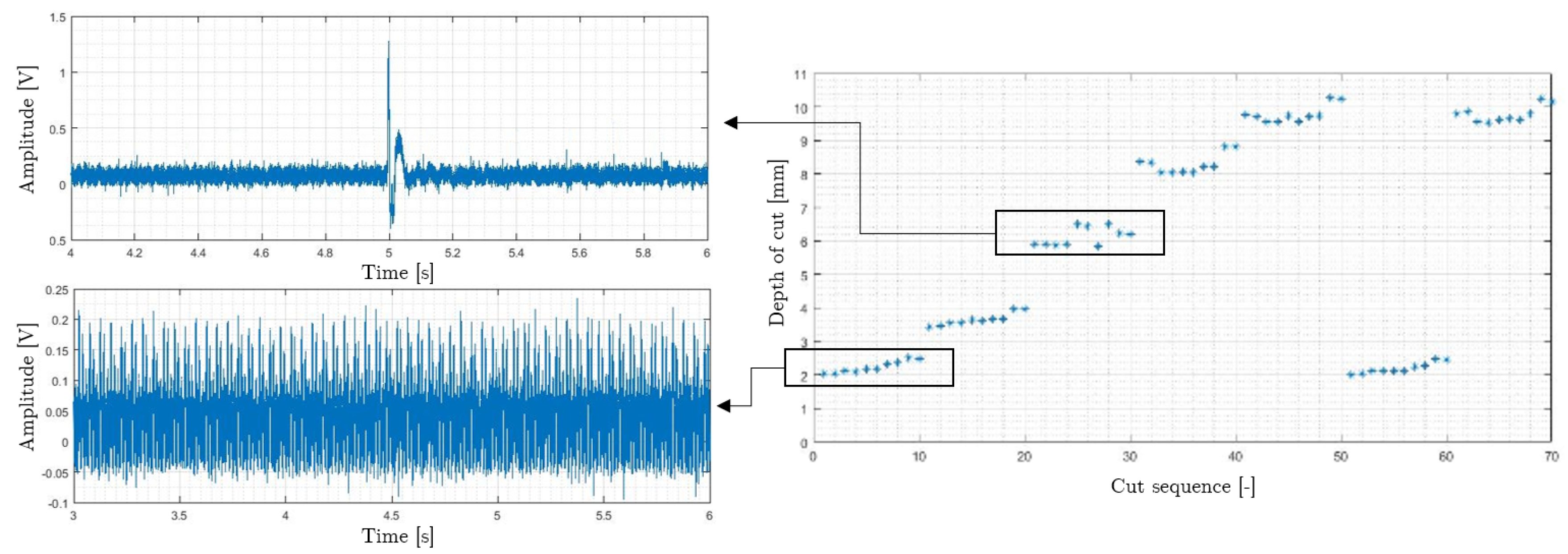 - Gaja, H.; Liou, F. Automatic detection of depth of cut during end milling operation using acoustic emission sensor. Int. J. Adv. Manuf. Technol. 2016, 86, 2913–2925. [Google Scholar] [CrossRef]