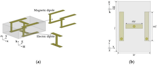 Here, the alignment of both dipoles was based on a y-polarized TEM wave propagating along the z-axis. The unit cells were simulated using Ansys high frequency structure simulator (HFSS) and the excitation and boundary conditions were used with wave ports and perfect electric conductor (PEC)/perfect magnetic conductor (PMC) boundaries, respectively. In the design, we used a 1.6 mm-thick double-layer FR4 substrate with a relative permittivity (εr) of 4.3 and loss tangent (tan δ) of 0.008. The unit cell area was fixed to a length (l) of 6 mm and width (w) of 3.9 mm. We used the rectangular-shaped unit cell to support long asymmetric current flow and a close space between the two magnetic dipoles to achieve a high Zms value and a low discretization error along the x-axis. Geometrical parameters of the unit cell included ml (the length for the magnetic dipole), g (the gap between the capacitively coupled electric dipoles), and ew (the width of the capacitor of the electric dipoles). Last, el indicates the electric dipole length, which is dependent on g. Therefore, we varied ml for the desired values and g and ew for the tuning. One benefit of this unit cell topology is that electric and magnetic resonance can be controlled independently because both electric and magnetic structures are implemented perpendicularly by the intuition of Huygens’ surface electric and magnetic currents. Finally, a unit cell with ml = 3.64 mm, g = 3.68 mm, and ew = 1.7 mm achieved high and values of 7.55 and 5.87, respectively, with an S21 of −0.96 dB and −150° transmission phase. To balance and , resonance where the peak of Yes occurs has to be located near 12.4 GHz, which was implemented with lower capacitance by using a wide gap distance (g = 3.68 mm) between the two electric dipoles, as shown in Figure 3b. However, the resonance should be near 10 GHz to achieve a sufficiently high value to match the value at 10 GHz. Figure 3c shows a high magnetic field excited along the x-axis due to current flows on the magnetic dipoles.