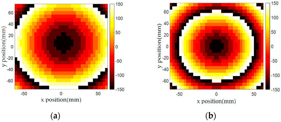 In Equation (5), is the distance between the center of the unit cell element and the focal point and f is the focal distance. We used the wavenumber () from the 10 GHz frequency and set to −150° as the default phase at the center of the array where and f are equal. One thing to note is that due to the unit cells’ compact size, steeper phase changes required for short focal distances could be realized with a low discretization error. Finally, we arranged different numbers of rectangular-shaped (3.9 × 6 mm) unit cells along the x-axis (39 cells) and y-axis (26 cells) to realize a near 5λ × 5λ-sized (152.1 × 156 mm) focusing lens. Figure 11c,d shows the implemented phase distribution of both focusing lenses. Because the calculated phases near the center of the focusing lenses were located in the middle of the 30° phase gap of the unit cells, a slight phase difference between Figure 11a,b and Figure 11c,d near the center area was allowed in the design process.