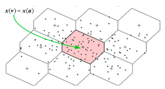 Figure 1 presents an example of a few Voronoi cells and some cloud of float positions in 2D space. The good Voronoi cell is located in the center. The shape and the size of the Voronoi cell depend on the geometry configuration and the carrier wavelength, respectively. These cells in the coordinate domain can be empirically generated based on Equation (6) from a dense set of points.