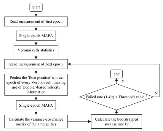 The success rate of MAFA using single epoch or multi-epoch observations with simple time-average operation in static mode is usually very low, which restricts MAFA application. Therefore, the kinematic ME-MAFA is proposed to improve the model strength and thus can increase the success rate of MAFA ambiguity estimation effectively. The algorithm of the kinematic ME MAFA algorithm is shown in Figure 2.