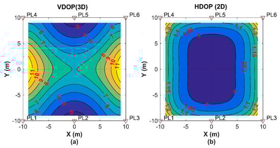 VDOP (vertical dilution of precision) and HDOP (horizontal dilution of precision) in 2D mode of the pseudolite layout. (a): VDOP for 3D positioning; (b): HDOP for 2D positioning implemented in this paper.