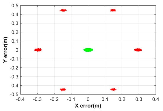 Scatterplot of positioning errors for the correct fix solution (green dots) and wrong fix solution (red dots).