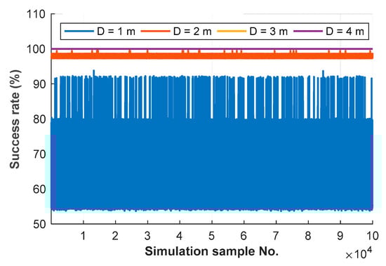 Figure 9 shows computed lower-bound success rates of 105 samples of four geometry configurations, according to Equations (32) and (34). For smaller geometry change, the theoretical lower-bound success rate is lower, as shown in the middle column of Table 4; and the computed lower-bound success rates are lower and their fluctuation is larger due to wrong fix solutions. For visualization purposes, the fail rate is shown in Table 5 instead of the success rate. For 4 m of moving distance without any wrongly fixed solution, the statistical fail rate is approximately equal to the theoretical success rate. Thus, for reliable AR without further validation in the real-world applications, the threshold value of the fail rate is set to 5 × 10-9, according to the guideline from this simulation.