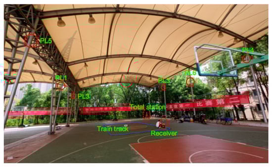 To validate that the kinematic ME-MAFA is capable of producing reliable AR, the field test is conducted at a semi-enclosed basketball court in National University of Science and Technology on August 30, 2020. The experimental pseudolite system consists of six pseudolite (PL1~PL6) transceivers and a user receiver, as shown in Figure 10. Antennas of six pseudolies are mounted on the metal columns. PL1 was chosen as the master pseudolite and all other slave pseudolites are synchronized with it. Additionally, the PL1 is chosen as the reference pseudolite. The coordinates of each pseudolite transmitting antenna are listed in Table 6, determined by a total station setting at the margin of test field. The antenna of user receiver is installed on a toy train, moving along the train track at an approximate speed of 0.75 m/s. The 2D positioning experiments are conducted. The height of the receiver antenna is fixed at 0.471 m. During the circumnavigation, HDOP values are between 0.98 and 1.1.