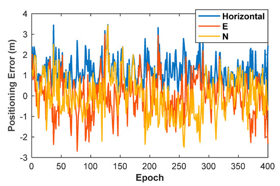 The priori position of the kinematic ME-MAFA is determined using the pseudorange measurement. In order to counter the pseudorange multipath in the terrestrial pseudolite system, the chip-rate is increased to 10.23 million chips per second. The pseudorange positioning errors are shown in Figure 12, and the maximum of horizontal positioning errors is 3.45 m. To achieve reliable AR, the search radius of the kinematic ME-MAFA is set to 4 m.