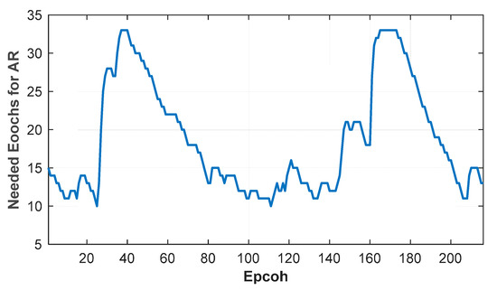 The kinematic ME-MAFA algorithm uses a variable number of epochs for a multi-epoch AR until reliable AR is achieved. During a round trip, the integer ambiguities of all test groups are estimated correctly, and the actual success rate is 100%. The numbers of epochs needed to meet the threshold value of the fail rate are shown in Figure 13. The maximum and the average of the number of epochs needed for AR are 33 and 19 (or 6.6 and 3.8 seconds of carrier phase observation), respectively. Due to the poor accuracy of the priori position, the number of search grids in the 4 m radius circle is 5449. After the search of the first epoch, the maximum and the average of the number of the Voronoi cells are decreased to 3710 and 3419. Therefore, the computation time of the kinematic ME-MAFA using the Doppler-based velocity information is shortened by about 37.2% on average. The average computation time in these searches is 26.1 seconds (MATLAB Windows environment on a 2.6 GHz Intel CPU).
