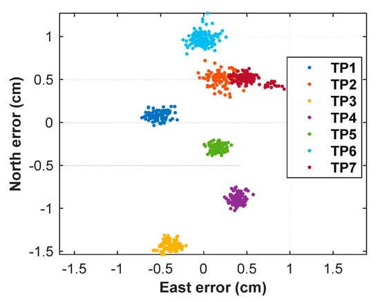 The positioning errors corresponding to seven TPs are shown in Figure 15. The positioning accuracy statistics of the mean, root mean square (RMS), and standard deviation (STD) values are given in Table 8. The STDs are smaller than 0.15 cm, and the RMSs range from 0.343~1.487 cm for all TPs. The maximum of the positioning errors is 1.61 cm. The positioning biases are most likely caused by the multipath error and the antenna phase center offsets.