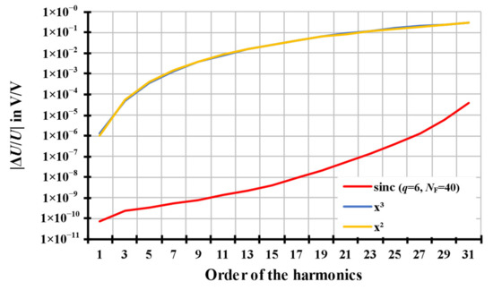 For the relative amplitude errors, the results of the resampling algorithms based on the quadratic and the cubic interpolations, shown as the orange curves and the blue curves, respectively, in Figure 10 (above), are practically identical. The relative amplitude errors of the square waveform signal range from 10−6 V/V to 0.2 V/V. The relative amplitude errors of the modified sinc algorithm, shown as the red curves in Figure 10 (above), are several orders more accurate than the quadratic and the cubic algorithms. The relative amplitude errors of the fundamental signal are below 10−9 V/V and below 10−4 V/V for the 31st harmonic of square waveform signal.