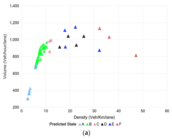 To assess the freeway operations, level-of-service (LOS), a commonly used performance indicator, was used for qualitative evaluation purposes. The data collected from the VISSIM simulation was further divided into six levels [72], wherein the LOS defines the traffic state of each level. Traffic state is usually characterized by traffic-density on a given link, and is directly related with the number of vehicles occupying the roadway segment. It also represents the transient boundary conditions between two LOS levels. Moreover, to test the efficacy, classification models were built in python scripting orange software and azure machine learning to write the required procedures for extracting the traffic parameters, and level-of-service corresponded to highway capacity manual (HCM) [43,73]. The data points (in Figure 7) represent different points in time distributed spatially, which together define the LOS at the road segment. In the mentioned figure, different colors showed the states for 15 min, which is actually the LOS divided into six sub-levels based on density along the highway segment. We termed these levels as different states (from A to F) and further evaluated them for 5, 10, and 15 min intervals. Since stratified K-fold cross validation was opted to address the issue of imbalance data, the method aimed to choose the proportionate frequencies for each LOS class. Thus, it is likely that label D or any other label will be associated with true representative class. The actual density–flow captured on a segment of the Second Ring was simulated in VISSIM for a prediction horizon of 15 min and is shown in Figure 7.