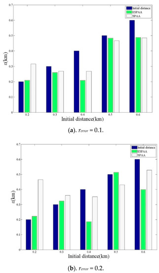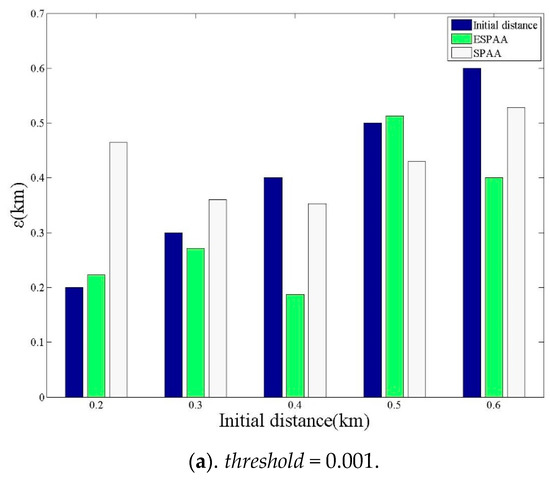 The threshold will affect the number of searches in the algorithms, and then further affect the final positioning results. The coefficients of the experiment are set as follows: rerror = 0.2(m) and r1 = 0.5(m). The following experiments were conducted with three different thresholds, threshold = 0.25 km, threshold = 0.01 km and threshold = 0.001 km. As Figure 11 shows, it can be found that when threshold becomes larger, the positioning errors of both SPAA and ESPAA are significantly reduced. This is because threshold can affect the number of searches. When given a smaller threshold, the positioning error of the ESPAA is smaller than SPAA, thus showing the effectiveness of the proposed ESPAA. The results of threshold = 0.01 and threshold = 0.001 did not show much improvement, so the attack algorithm still has its limit. In sum, if the threshold can be set properly, the best positioning effect can be achieved with the least number of searches.