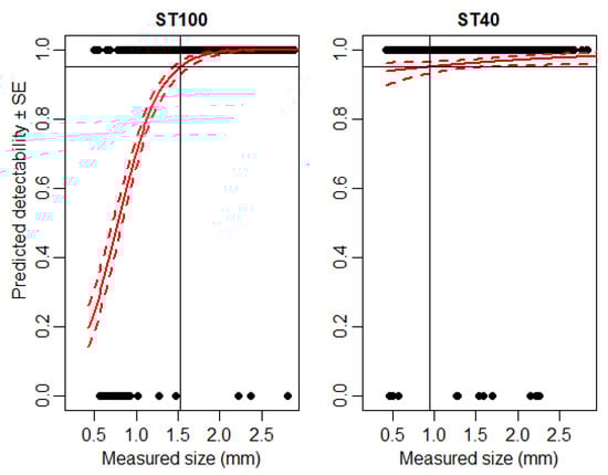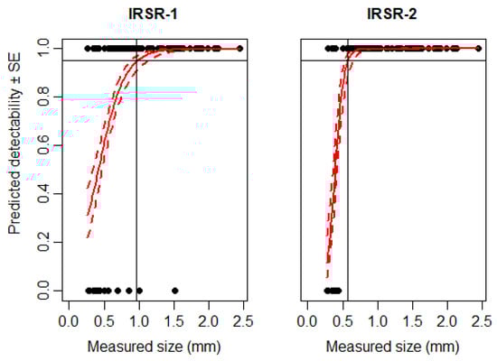 Expected detectability (continuous red line) ± SE (dashed red line) of grain particles according to particle size using IRSR-1 and IRSR-2. A binomial generalized linear model (GLM) was used to estimate detectability. The 95% detection level is shown by the continuous black line. The detection threshold of the sensors was set to sensitivity threshold (ST) = 100.