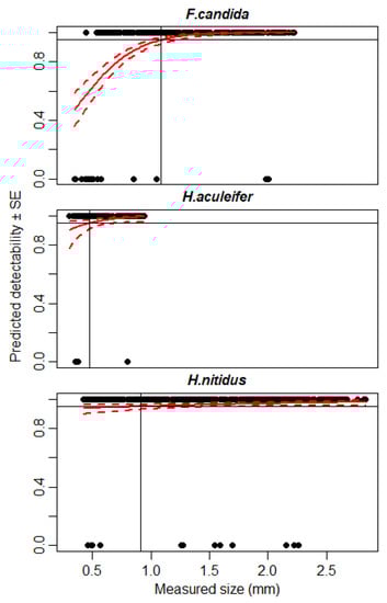Expected detectability (continuous red line) ± SE (dashed red line) of three microarthropod species: F. candida, H. nitidus, and H. aculeifer. A binomial GLM was used to estimate detectability. The 95% detection level is shown by the continuous black line. The detection threshold of the sensors was set to ST = 40.