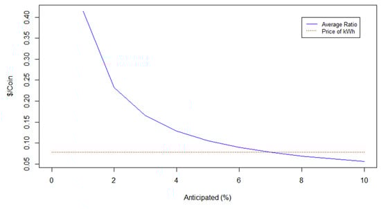 As seen in the above figure, the distribution we followed led to actual savings close to 7% of the anticipated savings, which justify the fact that the average ratio was slightly higher than the price of electrical energy when we expected 6%. However, if the reg the value chosen for the anticipated savings is very pessimistic; therefore, low, the average of the ratio increases disproportionally. This causes our coin to have much more value than the entity it represents making it very dangerous for money laundering schemes, which is something that should be taken into account as the anonymity that blockchain offers in cryptocurrency transactions make it possible for cyber-criminal actions to arise []. This proves that choosing realistic values on our constants is of vital importance for the evaluation of the program. Moreover, in case the ratio starts to take values that do not correspond with the basic ideas of the coin, intervention from the authority running the scheme might be necessary in the form of allocating the budget differently or changing some of the constants.