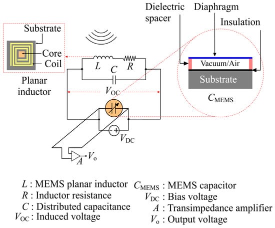 The lumped resistance of the loop is comprised: (1) radiation resistance corresponding to the loss in the antenna during the transformation of EM energy into electrical energy, (2) loss due to the DC resistance of the conductor and (3) AC loss due to the skin effect In Figure 3, represents the distributed capacitance of the square loop, and represents the variable capacitance between the deformable diaphragm and the backplate, which is in series with the capacitor self-resistance . A damping resistor is used between the inductor and the MEMS variable capacitor to enable a flat frequency response over the target UWB frequency range. These parameters can be calculated following the mathematical models available in []. A DC bias voltage is superimposed on the actuating AC voltage across the MEMS capacitor to set the static operating point and facilitate capacitive readout.
