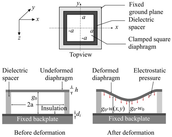 This induced voltage superposed by a bias voltage accumulates opposite charges on the capacitor electrodes to generate a coulombic attraction force between the diaphragm and the backplate. As the backplate (bottom electrode) is rigidly fixed and the diaphragm (top electrode) is thin with rigidly clamped edges, this force deforms the diaphragm as shown in Figure 2. In Figure 2, is the zero-force gap, is half of the diaphragm side-length, is the diaphragm thickness, is the thickness of the bottom insulation layer, and is the deflection of the diaphragm center. The deformation modifies the gap between the diaphragm and the backplate of the capacitor to affect a change in capacitance. This capacitance change is sensed using a transimpedance amplifier along with a DC bias to generate an output voltage as shown in Figure 1.