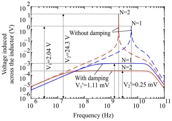 To obtain a flat frequency response in the target UWB frequency range, the antenna loop should operate in a short circuit mode [,] as a highpass filter comprised of and with a cut-off frequency defined by . Running the loop in a short circuit mode, the distributed capacitive reactance has no effect on the output, ensuring immunity against parasitic capacitance and less coupling with nearby objects []. However, the damping resistor in parallel with creates a lowpass filter with a cut-off frequency []. By making , the current in (8) can be approximated as