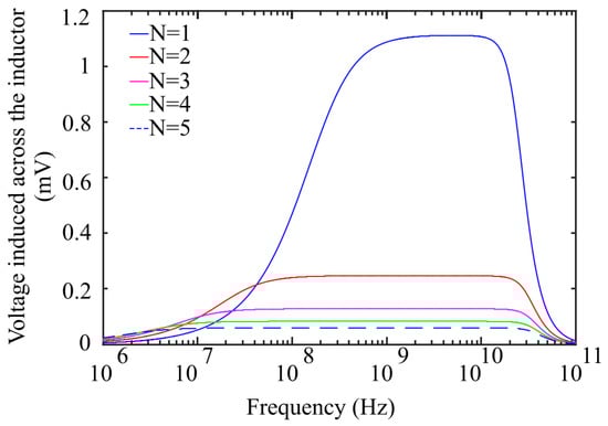 Voltage generated across the loop inductor as a function of number of loop turns .