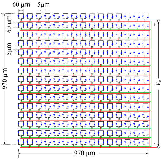 To realize a crossed parallel sub-loop based inductor, the single loop is divided into several smaller loops keeping the same total area and cross-connecting them as shown in Figure 6, so that the current directions of adjacent arms of the successive inductors oppose each other to reduce the mutual inductance. With this configuration, the effective loop inductance is lowered and the loop current is maximized for the same lateral dimension []. Following this approach, simulations of different configurations of crossed parallel sub-loops are conducted in PSpice® by varying the number of sub-loops , the length of the conductor, and the width of the conductor to determine the final specifications of the loop inductor. The connections among the sub-loops are shown in Figure 7. To minimize , gold was selected as the material for the loop inductor due to its high conductivity and ease of microfabrication.