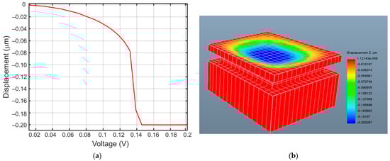 The resulting transfer curve showing the nonlinear displacement of the diaphragm center as a function of bias voltage is shown in Figure 9a. The corresponding 3D FEA model of the capacitor sensor geometry is shown in Figure 9b, which shows the collapsed diaphragm after pull-in.