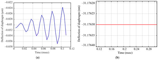 As the fundamental resonant frequency of 45.75 kHz (Figure 8) of the diaphragm was much lower than the target 3.1–10.6 GHz UWB frequency range, only the RMS value of the induced voltage across the capacitor contributed to the electrostatic force, causing a deflection of the diaphragm. To verify the fact, a 3D FEA-based transient analysis was conducted to determine the diaphragm deflections for 1 mV AC voltage at 45.75 KHz and for 1 mV AC voltage at 5.1 GHz. The resulting diaphragm deflections as a function of time are shown in Figure 10. Figure 10a shows the deflection of the diaphragm at 45.75 kHz AC voltage actuation, while Figure 10b shows the deflection at 5.1 GHz AC voltage actuation. As it can be seen, for the 5.1 GHz AC voltage actuation, the deflection was constant at approximately 31.17 nm and no oscillation of the diaphragm with respect to the actuation frequency can be observed. This observation is consistent with (4) that predicts that for actuation at frequencies much higher than the resonant frequency of the diaphragm, the diaphragm vibration cannot follow the oscillating frequency due to inertia and RMS value of the electrostatic force that contributes to deflection. A much larger amplitude oscillation of the diaphragm near fundamental resonant frequency is visible in Figure 10a.