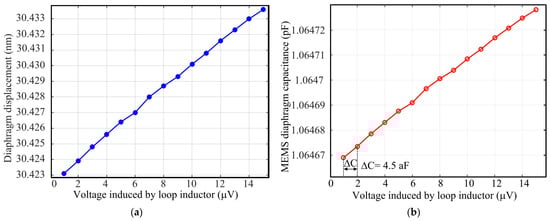 Figure 11a shows 3D FEA-simulated deformation of the capacitor diaphragm for a parametric voltage sweep using IntelliSuite™, and Figure 11b shows the corresponding capacitance of the MEMS capacitor. Figure 11a reveals that the center deflection of the diaphragm is linear with increasing actuation voltage, and a deflection variation of ~0.8 pm is observed for every 1 µV change in the actuation voltage (loop inductor induced voltage). This deflection variation translates to a mechanical sensitivity of 0.8 pm/µV. The corresponding capacitance change is 4.5 aF/µV, as can be seen in Figure 11b.