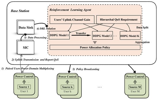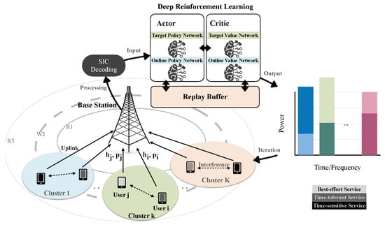 RL is built between the base station (BS) and the user based on Contract Theory in heterogeneous uplink NOMA and imperfect CSI []. The actor–critic algorithm is used to control downlink NOMA and maximizes the sum of the user’s rate []. Yet, the actor–critic network has the problem of convergence. Zhang et al. used the deep reinforcement learning (DRL) algorithm DDPG to maximize the sum of user energy efficiency []. In [], hardware sensitivity and imperfect successive interference cancellation (SIC) are considered. Additionally, a multiagent structure and a convolutional neural network are adopted to reduce the complexity of the power allocation in NOMA. The authors of [] proposed asynchronous reinforcement learning-based schemes to solve joint relay selection and power allocation, which is a complicated high-dimensional optimization problem. In the above, the scheduling variable in some references is discrete, resulting in quantization errors, and they only discuss single QoS for all users while ignoring the multiple QoS requirements brought by differentiated services, i.e., hierarchical QoS, such as delay-jitter-sensitive services and instant messaging services.