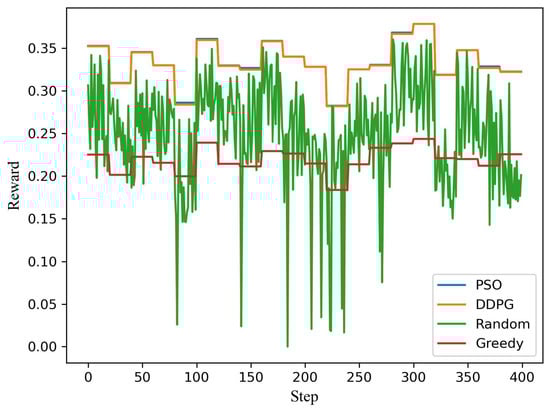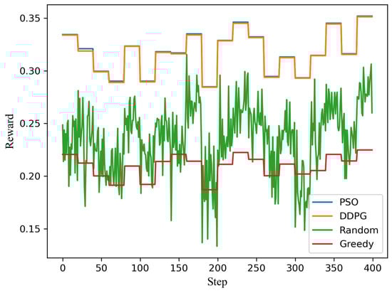 Figure 4 shows the testing of the model under the dynamic channel and user demand. The test runs 400 steps, and the vertical axis is the reward for each step. There are four schemes (PSO, DDP, Random, and Greedy). The population size of the PSO algorithm is 10,000, and the number of iterations is 100. DDPG and PSO algorithms have similar and far better performance than the other two schemes (Random and Greedy). A penalty value in reward is nonzero if the user’s demand is not satisfied. However, the reward is always greater than or equal to zero. Therefore, it can be seen that a random scheme often reaches zero. From the above simulation, it can be seen that the DDPG algorithm can efficiently solve the power allocation of 2 users with time-varying demands assembly. The following scenario is simulated with the random demands of 10 users to analyze the user scalability of the algorithm.
