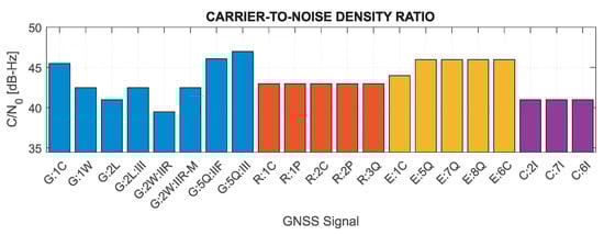 The numbers in Table 1 for a very low elevation satellite illustrate the lower values of the received signal power that can be acquired. This signal power relates directly to the minimum received signal power that is a guaranteed minimum received power level, as specified in the Interface Control Document (ICD) for each of the GNSS systems, but may vary slightly depending on the signal power budget assumptions. Based on the minimum received signal power, compiled in [], the nominal (theoretical) C/N for GNSS signals were determined. Figure 1 shows the C/N for individual systems and signals analyzed in the study, distinguishing between individual satellite blocks for GPS signals. Note that if the information on the power of a given signal was not publicly available (as in the case of GLONASS P-code or BeiDou 6I), values for other signals of the given system were adopted for the calculation. Based on the presented values, it can be concluded that the nominal signal quality differs significantly between systems, reaching the lowest values for GPS 2L, 2W and BeiDou signals, which may considerably affect the GNSS receiver performance.