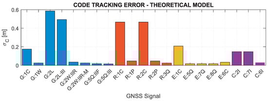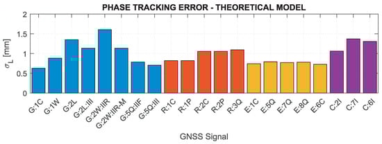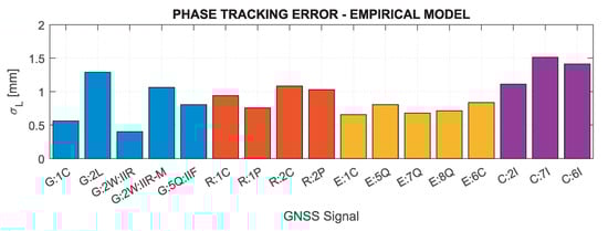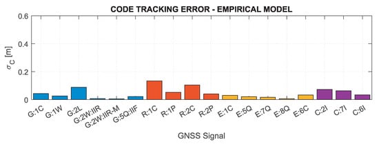 Based on the above formulas, assuming the C/N determined for the minimum received signal power and the characteristics of the tracking loops for the Septentrio PolaRx5 receiver, which was used in the measurement experiment ( Hz, Hz, s, s, ), the nominal errors of GNSS measurements were determined. Figure 2 and Figure 3 show theoretical tracking errors for code and phase observations, respectively, for signals corresponding to those shown in Figure 1. The carrier phase observation errors accurately reflect the variability of C/N—the lower the value, the greater the error. For code observations, high error values of GPS 2L and GLONASS 1C and 2C signals are distinguished. This is mainly caused by the narrow nominal bandwidth of these signals, which is generally smaller than the actual transmission bandwidth [].