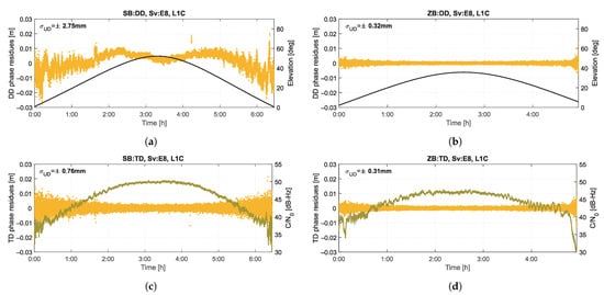 Time series of carrier-phase residuals of Galileo L1C signal from Sv8 for combinations: SB DD (a), ZB DD (b), SB TD (c), ZB TD (d).